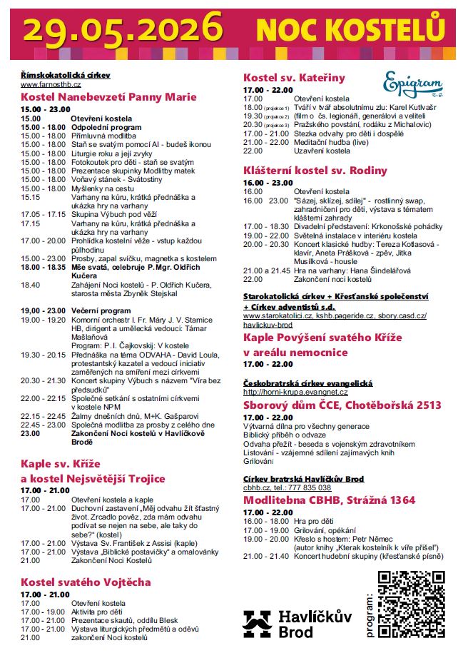 Noc kostelů v Havlíčkově Brodě bude mít opět velmi bohatý program. Přinášíme vám jej na obrázku níže. Letošním mottem je ODVAHA.